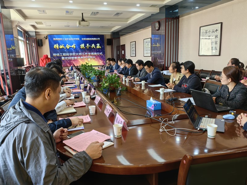 10月16日下午,比亚迪现场工程师学院技能大师工作室揭牌仪式暨“双师型”教师教材评审会议在我校顺利召开。比亚迪股份有限公司晁蓉、杨双喜、杨涛、魏可心等;风向标产教融公司荣维涛、李丹;行云新能科技(深圳)有限公司张铁军、苏学园、潘小豪;我校副校长张永军、教务处、校企合作处、教师发展中心、汽车工程学院相关负责人出席会议.会议分为两项,第一项是比亚迪现场工程师学院技能大师工作室揭牌仪式,由我校教师发展中心主任胥航军主持;第二项是“双师型”教师教材评审会议,由比亚迪汽车股份有限公司西北地区招聘经理杨涛主持。