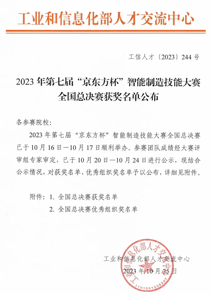 2023年10月,第七届“京东方杯”智能制造技能大赛成功举办。来自全国28个省的150支队伍共计300名选手参加此次比赛。经过激烈比拼后,我校智能制造学院教师李俊雨指导的学生朱康杰、聂光坤荣获国赛团体一等奖,实现了我校在该赛项国赛上的突破。同时,臧家鑫、贾娇娇荣获国赛团体二等奖,陈江铖、张正、张天翔、王荣荣等四支队伍荣获国赛团体三等奖。