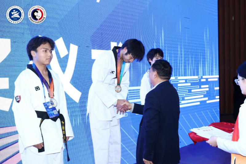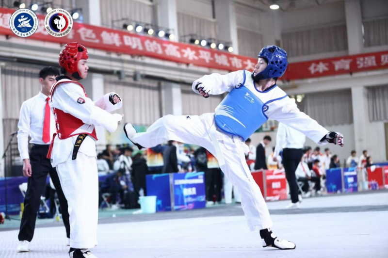 赛场上,跆拳道运动员们身着道服,佩戴护具,或主动进攻,或积极防守。旋风踢、下劈、侧踢、横踢等高难度动作轮番上演,一招一式迅猛敏捷、稳劲有力。赛场外,各参赛队相互交流,为上场队员们呐喊、助威。