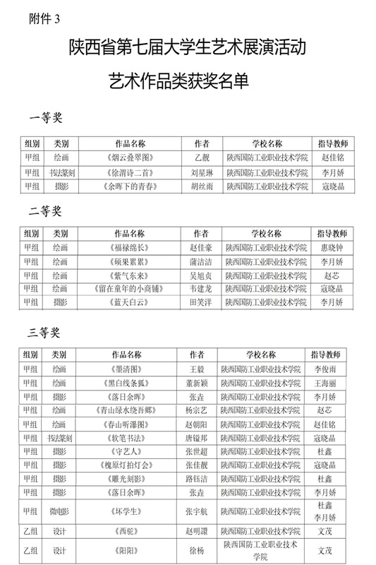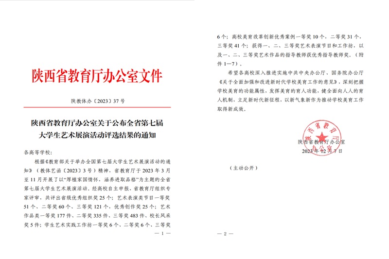 12月7日,陕西省教育厅发文,公布了以“厚植家国情怀,涵养进取品格”为主题的全省第七届大学生艺术展演活动获奖名单,我校报送的作品在本次展演活动中斩获佳绩、实现突破。