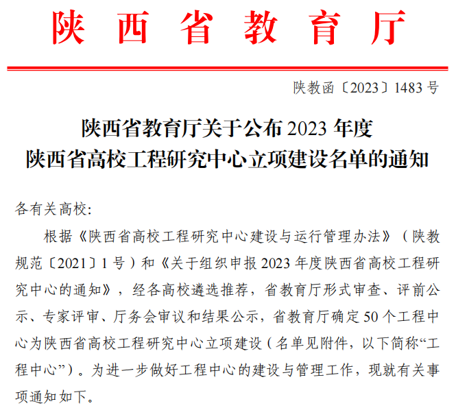 12月18日,根据《陕西省高校工程研究中心建设与运行管理办法》(陕教规范〔2021〕1 号)和《关于组织申报 2023 年度陕西省高校工程研究中心的通知》,经各高校遴选推荐,省教育厅形式审查、评前公示、专家评审、厅务会审议和结果公示,省教育厅确定50个工程中心为陕西省高校工程研究中心立项建设单位,我校科研管理处和人工智能学院组织申报的“工业智联网应用陕西省高校工程研究中心”成功获批。该中心将为我校电气自动化、工业互联网、物联网与人工智能领域的综合研究与发展提供有力支持,推动产学研一体化发展,助力工业智联网技术创新与产业发展。
