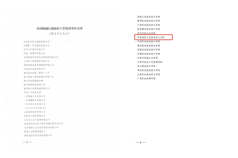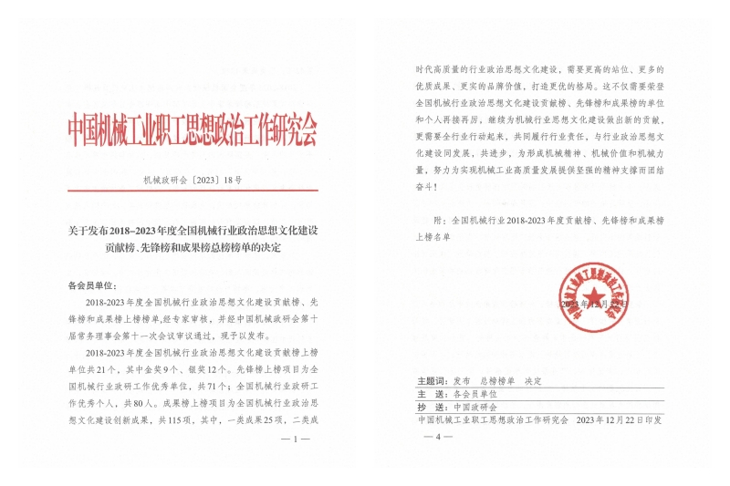 2023年12月22日,中国机械工业职工思想政治工作研究会印发《关于发布2018-2023年度全国机械行业政治思想文化建设献榜、先锋榜和成果榜总榜榜单的决定》(〔2023〕18号)。18新利苹果客户端荣获全国机械行业政研工作优秀单位称号,学校报送的创新成果《军工高职院校红色文化育人模式实践研究》《弘扬科学家精神,建设“大思政课”》分别入选全国机械行业政治思想文化建设创新成果二类成果和三类成果,党委宣传部陈小刚同志获评全国机械行业政研工作优秀个人称号。这是我校近年来首次获得全国机械行业政研工作优秀单位称号。