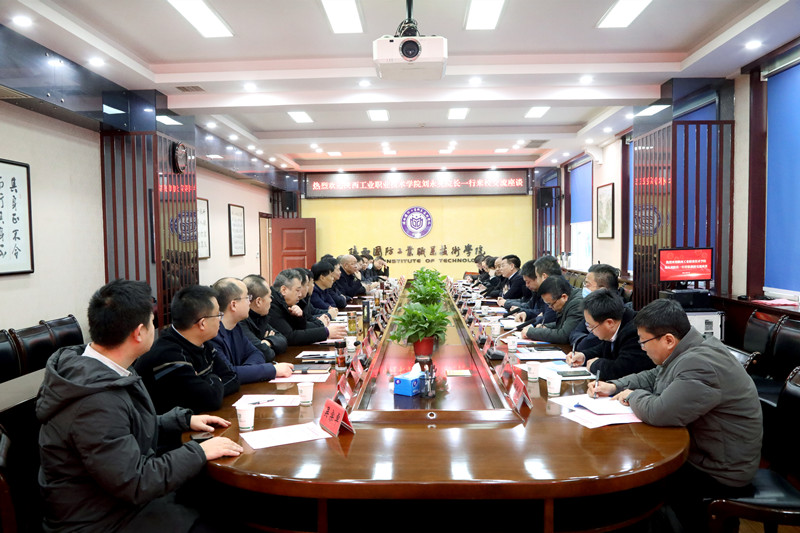 1月5日上午,陕西工业职业技术学院院长刘永亮,党委副书记田昊、副院长梅创社、副院长段峻等一行14人来我校交流调研。我校党委书记张卫平,校长刘敏涵,党委副书记杨聪,党委副书记、纪委书记王玉,副校长刘少阳出席会议。党政办、组织部、人事处、教务处、财务处、后勤处、发展规划处、科研处、继续教育与培训学院、化学工程学院、机械工程学院相关负责人参加了座谈会。会议由校长刘敏涵主持。