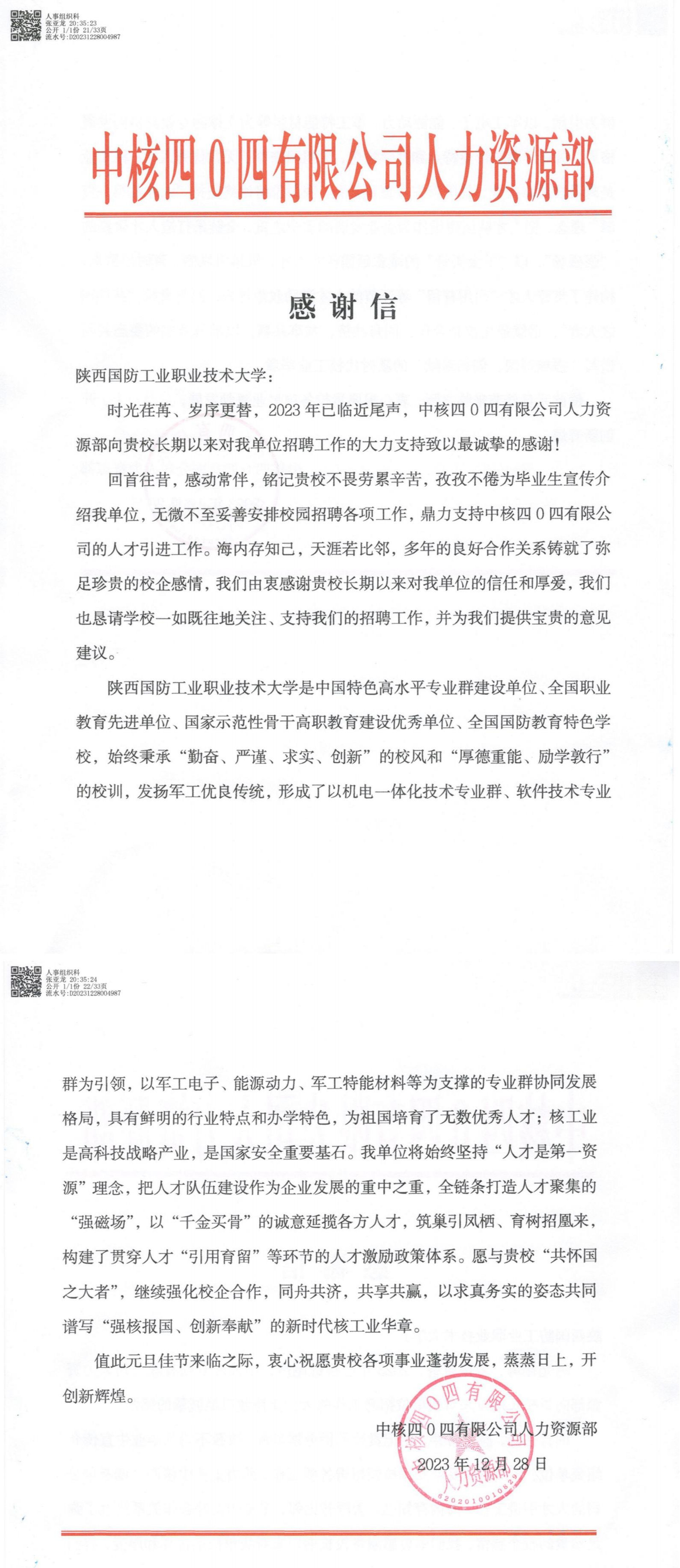 1月10日,我校收到中核四〇四有限公司发来的感谢信。信中指出,我校在校园招聘工作中积极帮助企业宣传并广泛动员毕业生参与,组织招聘活动顺利进行,相关意见和建议对于企业招聘工作的完善和发展起到了积极的推动作用,感谢我校对校园招聘工作的大力支持和卓越贡献,祝愿我校教育事业蒸蒸日上、再创辉煌!