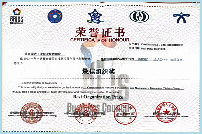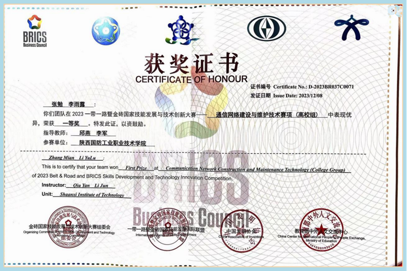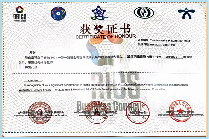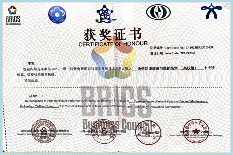 12月7日-8日,2023一带一路暨金砖国家技能发展与技术创新大赛“通信网络建设与维护技术”竞赛由金砖国家工商理事会中方理事会、一带一路暨金砖国家技能发展国际联盟联合主办,金砖国家工商理事会(中方)技能发展工作组在河北机电职业技术学院举行。本次国内总决赛共有来自全国23个省(区)、116所大中专院校以及企业职工,超过1600名选手共同角逐。由我院邱燕、李军老师指导的张勉、李雨露组成的参赛队获得一等奖(第7名)。我校获得最佳组织奖,指导老师邱燕、李军获得优秀指导教师奖。