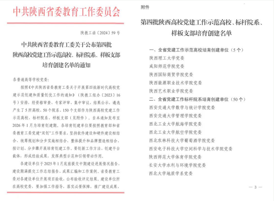1月16日,省委教育工委公布了第四批陕西高校党建工作示范高校、标杆院系、样板支部培育创建名单。我校艺术与设计学院党总支获评“标杆院系”培育创建单位,人工智能学院教师党支部、经济管理学院营销物流教师党支部获评“样板支部”培育创建单位。