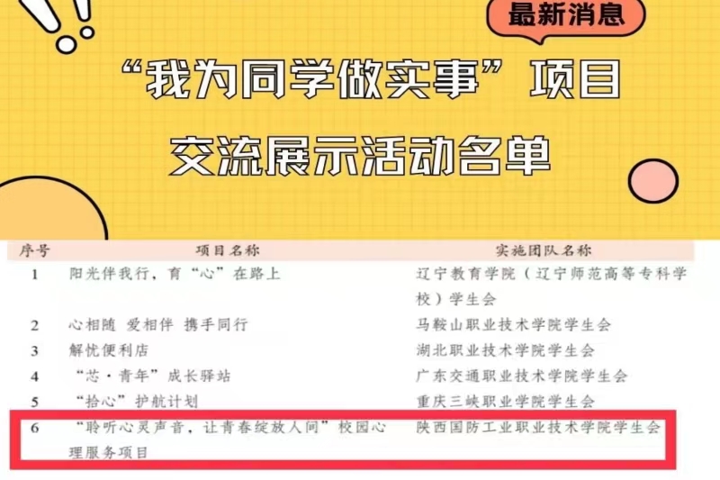1月27日,由共青团中央指导、全国学联主办、贵州省学联承办的全国高校学生会组织“我为同学做实事”项目交流展示活动名单公布,我校学生会“聆听心灵声音,让青春绽放人间”校园心理服务项目成功入选“心理健康类”项目名单。据悉,本次活动自启动以来,经学校自荐、省级推报、全国遴选,共产生高职(专科)学生会项目56个,我校是陕西省唯一一所成功入选的高职院校。