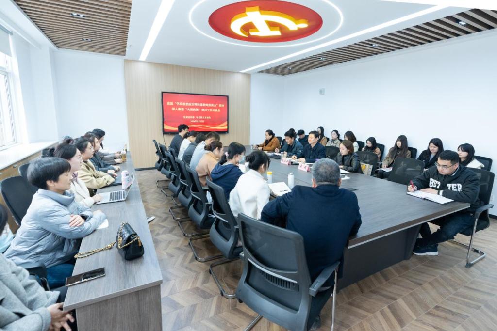 在习近平总书记“3·18”重要讲话发表五周年即将到来之际,我校党委宣传部联合马克思主义学院于3月12日召开了“重温学校思想政治理论课教师座谈会精神,深入推进‘大思政课’建设工作” 座谈会。校党委书记张卫平、党委宣传部部长张鑫、马克思主义学院院长吴娟以及全体思政课教师参加了此次座谈会。座谈会由马克思主义学院院长吴娟主持。
