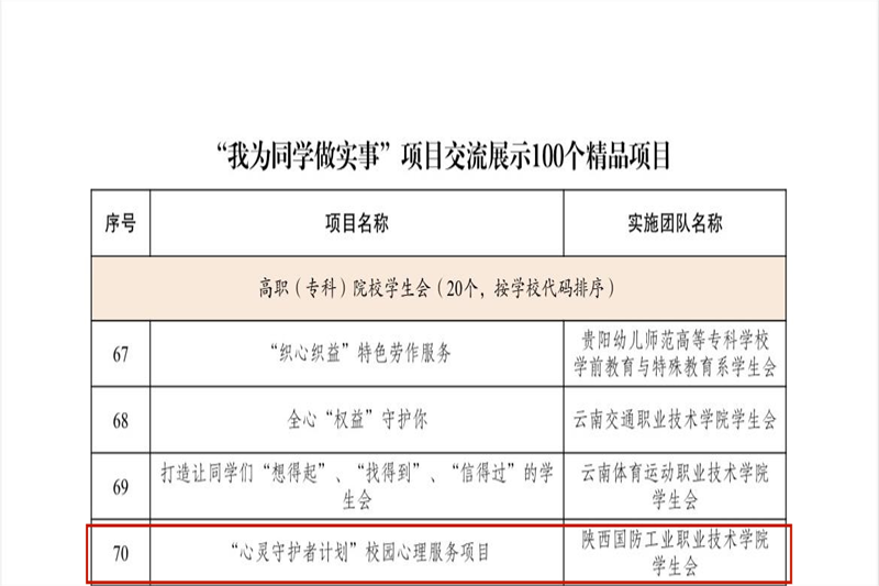 3月24日,由共青团中央指导,全国学联主办的全国高校学生会组织“我为同学做实事”项目交流展示活动在贵州师范大学落下帷幕。我校学生会“心灵守护者计划”校园心理服务项目披荆斩棘,脱颖而出,最终斩获全国精品项目。该项目全国共100个,高职高专组20个,我校参评项目是陕西高职院校唯一入围获评项目。