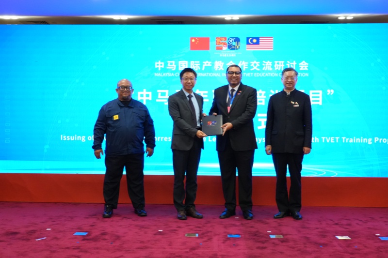 会上,我校向马来西亚全国职业工友会递交了参与“中马青年职教培训计划”的意向函,拟在2024年邀请马来西亚10-15名青年来华开展智能制造、新能源汽车、工业机器人等领域的职业技能培训,不断加强中马产教合作,增进两国人文交流,促进民心相通。马来西亚州议员、全国职业工友会顾问莫哈末·沙布丁、马来西亚全国职业工友会秘书长莫哈末·李占·哈山共同为我校颁发“中马青年职教培训”答谢函。