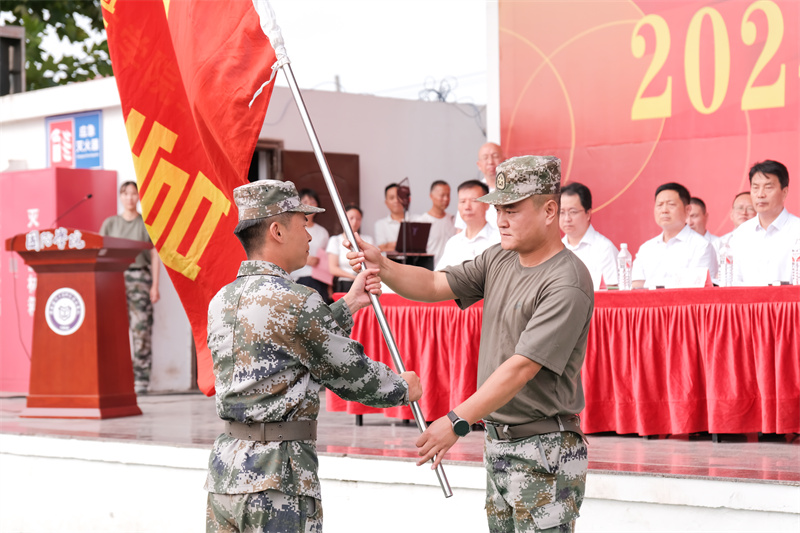 校党委书记全卫强给军训团授旗。军训团参谋长张楠给各营授旗。
