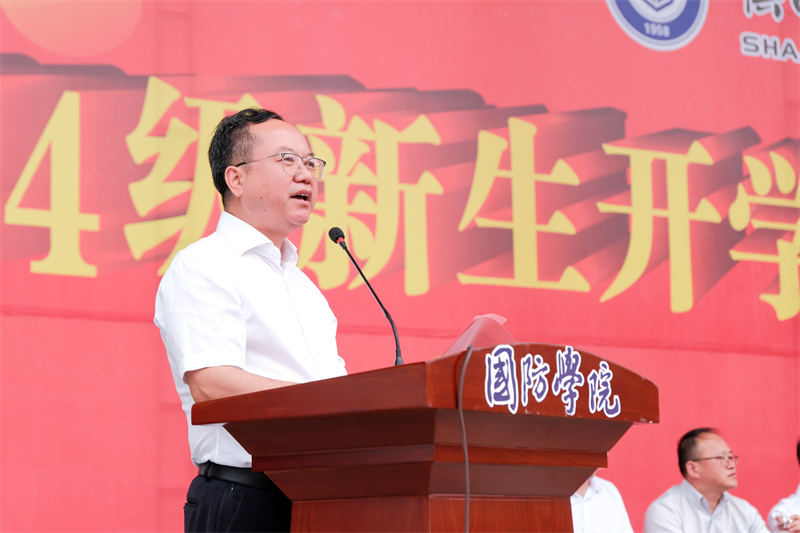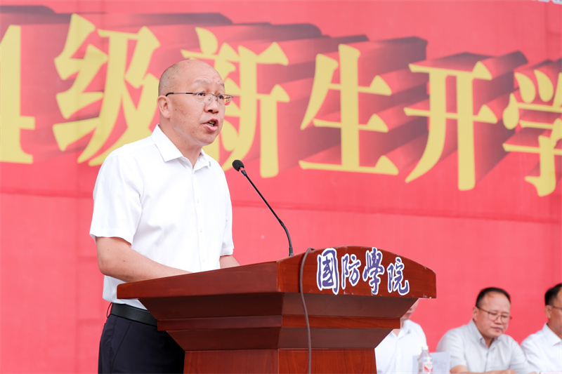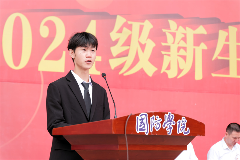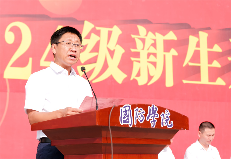 党委副书记杨聪致辞。他提出,军训作为大学生活的第一课,其意义远不止于简单的体能训练,它是一次心灵的洗礼,一次精神的磨砺,更是一次自我超越的旅程。同时,他提出三点希望:第一要坚定理想信念,心怀家国。第二,磨砺坚强意志,塑造坚韧品质。第三,强化团队精神,促进集体荣誉。