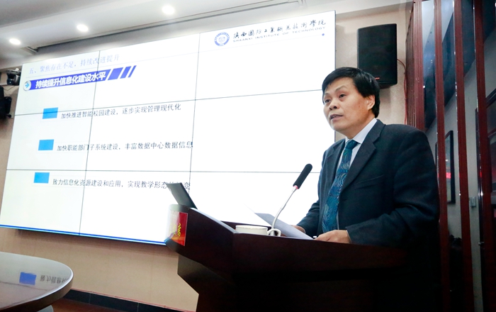 刘敏涵院长代表学校作内部质量保障体系诊断与改进工作汇报。他从军工文化引领,质量基础坚实;诊改理念引领,完善质保体系;校本平台支撑,进行自主诊改;关注目标达成,诊改成效凸显;聚焦存在不足,持续改进提升等五个方面进行了详细的阐述。