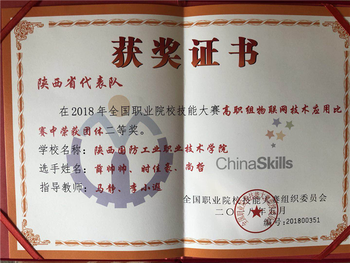 我校一直高度重视学生职业技能培养,通过技能大赛促进专业建设和教学改革,推进“以赛促教、以赛促学、以赛促发展”,全面提高人才培养质量。此次代表陕西获得团体二等奖,是对我校物联网专业教学成果的一次综合检验,在获得表彰的同时也使我们看到和全国其他高水平选手的差距。今后,我们将继续努力,不断学习交流,提升技能水平,在今后省赛国赛中,取得更好成绩!