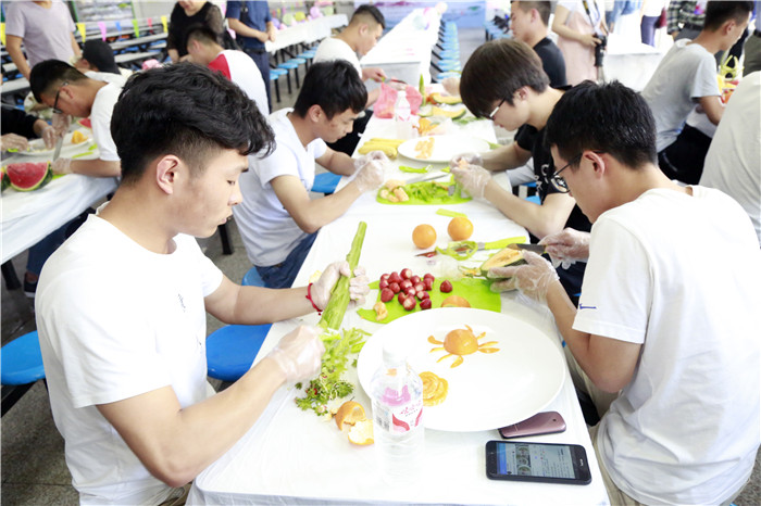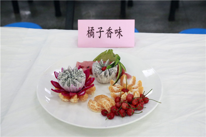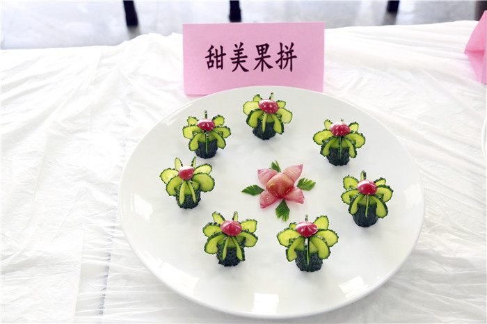 学生们的瓜果冷拼也毫不逊色,一招一式,显得十分娴熟灵活。创意冷拼“春天里的小螃蟹”、“国色天香”等令人眼前一亮。比赛中穿插的文艺表演及食品安全知识有奖竞猜等活动,更是将现场氛围推向了高潮。