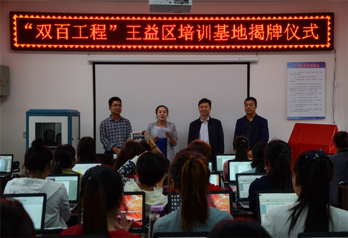在区高级职业中学,我校党委书记张卫平与王益区委副书记党莉共同为“双百工程”王益培训基地揭牌,并为首批参加“王益区学科骨干教师计算机应用能力提升培训”的40余名教师颁发了结业证书。