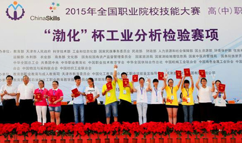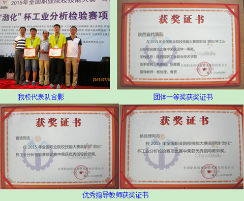 2015年全国职业院校技能大赛“工业分析检验”赛项于6月30日至7月3日在天津渤海职业技术学院举行,此次大赛共有来自全国32个省、自治区的63支参赛队的126名选手参加了高职组的比赛,由我校刘耀鹏教授带队,杨佳理、曹赟老师指导,313级高晨阳、赵露露同学组成的代表队代表陕西省参赛,各院校选手在专业理论、化学分析和仪器分析三个项目上经过三天角逐。最终,我校选手沉着应对、稳定发挥,经过紧张的竞赛,勇夺团体一等奖,创造了我校参赛队自参加该类赛事以来的历史最好成绩,同时两名参赛选手均获得破格晋升化工检验工高级工职业资格,两名指导教师获得优秀指导教师荣誉称号。