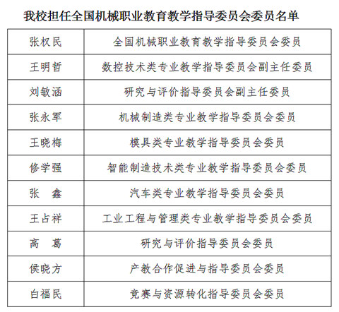 全国机械职业教育教学指导委员会,是受教育部委托,经中国机械工业联合会批准成立的对机械行业职业教育进行研究、咨询、指导、评估的专家组织,下设十二个专指委和五个专门工作委员会,具体承担组织开展全国机械类专业教育教学改革创新和行业职业教育专项活动的职能。我校11名教师当选行指委、专指委委员,体现了我校机械类专业在全国机械职业教育教学工作上的领先优势,标志着学校教师的专业实力和专业影响力不断增强,有利于学校进一步加强专业建设,办好人民满意的高等职业教育。