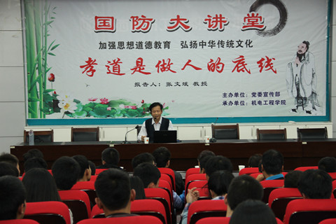 10月13日下午,学校党委书记张文斌教授做客“国防大讲堂”,作了一场题为“孝道是做人的底线”的专题讲座。来自机电工程学院的260多名师生聆听了张文斌书记的精彩讲座,讲座由机电工程学院党总支书记殷兴光主持。本次讲座由党委宣传部主办,机电工程学院承办。