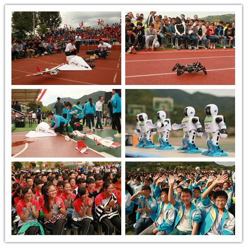 在展演中不但有我校学生自行编排的文艺节目,也有我校精心为荣程中学全校2800余名学子的科技展演,其中包含了无人机技术简介和飞行表演、微型机器人、履带车、六足机器人的制作原理和现场展示。经过我校教师深入浅出的现场讲解,现场学生对机器人、无人机等科技产品有了新的认识,纷纷表达了要努力学习实现科技梦想的决心。荣程中学的领导及全校教师也对我校此次科技展演表达了感谢之情,并赠送了锦旗。