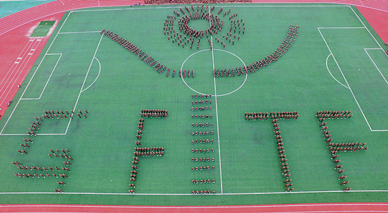 学生军训方队组成的“国防腾飞”字样