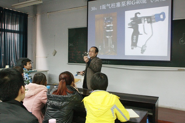 2012年3月6日,校企合作共同开发、建设和实施优质专业核心课程《涂料与涂装工艺》课程由美国固瑞克公司西北办事处西安天瑞涂料工程技术有限公司何安总经理给精化3101班讲授涂料涂装原理、简单涂装机械的使用和注意事项。课堂上,何总带来了固瑞克公司生产的各种涂装设备,并一一给学生做了介绍和涂装演示,形象生动,气氛活跃。在此之后的教学安排中,学生将去汽车涂装企业进行现场教学,亲临涂装现场,拓展学生知识视野,进一步了解涂装工艺流程。