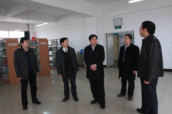陕西省委教育工委副书记、省教育厅厅长杨希文(左三)在学院党委书记张文斌(左二)、院长张权民(右一)等陪同下考察图书馆