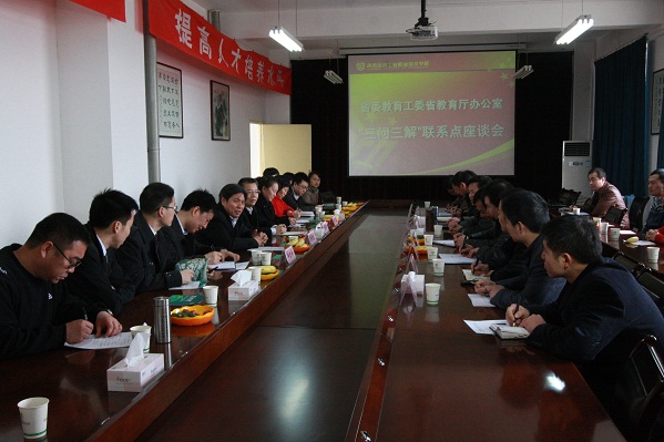 2012年3月17日,省委教育工委副书记、省教育厅厅长杨希文到我院出席省委教育工委、省教育厅办公室“三问三解”活动联系点座谈会并讲话,他强调,委厅机关各处室在“三问三解”活动中一定要深入联系点,着眼于解决实际问题,与师生作面对面心贴心实打实的交流,掌握第一手的情况,积极主动解民忧,深入细致解民怨,满腔热情解民困,全力帮扶促发展。