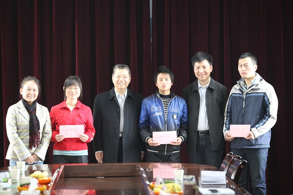 陕西省委教育工委、省教育厅办公室主任惠朝阳(左三)等与三位受助学生合影留念