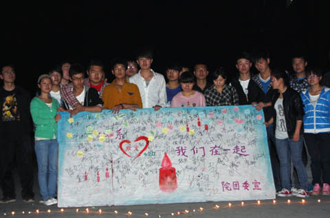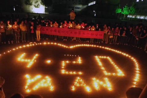在活动现场,师生们首先为灾区遇难同胞默哀,然后用蜡烛摆出一颗“