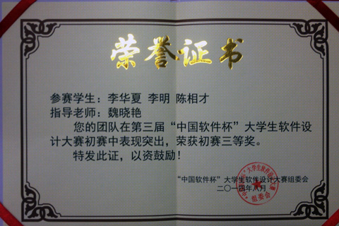 2014第三届“中国软件杯”大学生软件设计大赛由教育部、工业和信息化部、江苏省人民政府联合主办,江苏省经济和信息化委员会、江苏省教育厅、中国电子产业发展研究院、中国(南京)软件谷联合承办,大赛吸引近600个院校的2335支队伍参赛,涵盖了全国几乎所有211、985重点高校。本次大赛重点考察参赛者解决实际问题的能力,题目原型全部来自软件企业的现实技术需求,采用统一命题方式进行。决赛共分十个赛题,每支参赛队伍选择其中一个赛题自主设计应用系统(软件作品)参加角逐。大赛致力于正确引导我国在校学生积极参加软件科研活动,切实增强自我创新能力和实际动手能力,通过富有自由、开放、创新精神的软件类别设计大赛,为广大青年才俊提供一个脱颖而出的平台,为我国软件和信息技术服务业培养出更多高端、优秀的人才。