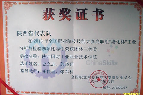 6月24日至27日,2013年全国职业院校技能大赛高(中)职组“渤化”杯工业分析检验赛项在天津渤海职业技术学院隆重举行。此次大赛为国家级职业技能大赛,比赛规格高、参赛人数多、社会影响大,共有来自全国30个省市的97支参赛队的194名选手参加本次大赛。我院化工分院311级史立志、郭晓茹同学组队(指导老师为杨佳理、张军科)代表陕西省参加了本次大赛。通过在专业理论、化学分析和仪器分析三个项目上三天的激烈角逐,最终凭借扎实的专业功底和出色的综合素质取得了团体三等奖的优异成绩。
