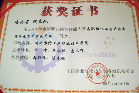 6月13日至16日,2013年全国职业院校技能大赛“化工生产技术”赛项在常州工程职业技术学院举行。本次大赛有来自全国31个省、市、自治区、直辖市的55所职业院校160余名选手进行了巅峰对决。我院化工分院张向阳书记率队前往,石化3113班惠永辉、符永胜、华坤(指导老师为张郢峰、汤春妮)代表陕西省参加了本次大赛。通过模拟仿真、精馏操作等环节的激烈角逐,凭借扎实的专业功底和出色的综合素质取得团体二等奖的优异成绩。