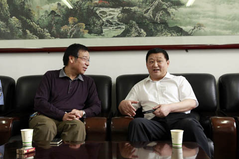 图2 张权民院长(左1)与邱彪局长就相关问题进行交流