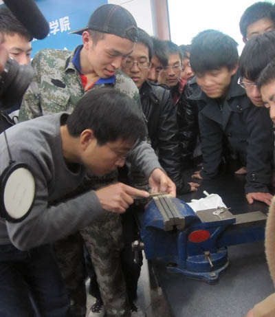 在模具设计巡讲中,陕西恒通智能机器有限公司谭威工程师、永济工模具分厂景克义高工、渭河工模具总厂高宏廷高工、陕西黄河工模具有限公司高建博高工以及我院模具专业李素丽老师分别介绍了自己在实际设计模具过程中的一些经验和新思路。在绝技绝活展示中,我院模具专业的两名学生就模具设计软件应用进行展示,全国劳动模范、永济工模具分厂薛金良技师展示了自己的绝活----目测配钥匙,引起了学生浓厚的兴趣。最后进行的校企联谊座谈环节,学生积极向各位专家请教,就专业发展、技能培养、课程学习、企业需求等问题展开交流。