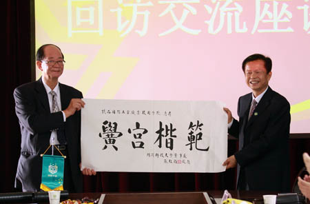 会上,张文斌书记对客人们的到来表示欢迎,介绍了我院的总体情况、国家示范性骨干高职院校建设情况。张绍钧董事长简要介绍了明新科技大学的办学、科研情况;张权民院长就明新科大对我院暑期学生交流学习代表团的热情接待表示衷心感谢。双方就师生交流学习、教育科研合作等问题进行了深入探讨,并初步达成了合作意向。随后,张董事长又与我院赴台师生进行了亲切交谈。