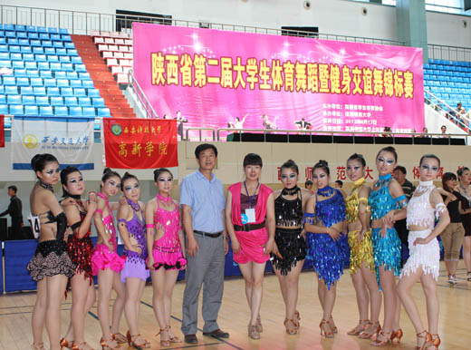 由陕西省学生体育协会主办,陕西师范大学承办的“第二届中国陕西省大学生体育舞蹈暨健身交谊舞锦标赛” 于6月17日在陕西师范大学长安校区隆重举行。我院在锦标赛中荣获拉丁团体舞第一名,个人赛多项第一,代表队教练李娟老师被评为“优秀教练员”的称号。