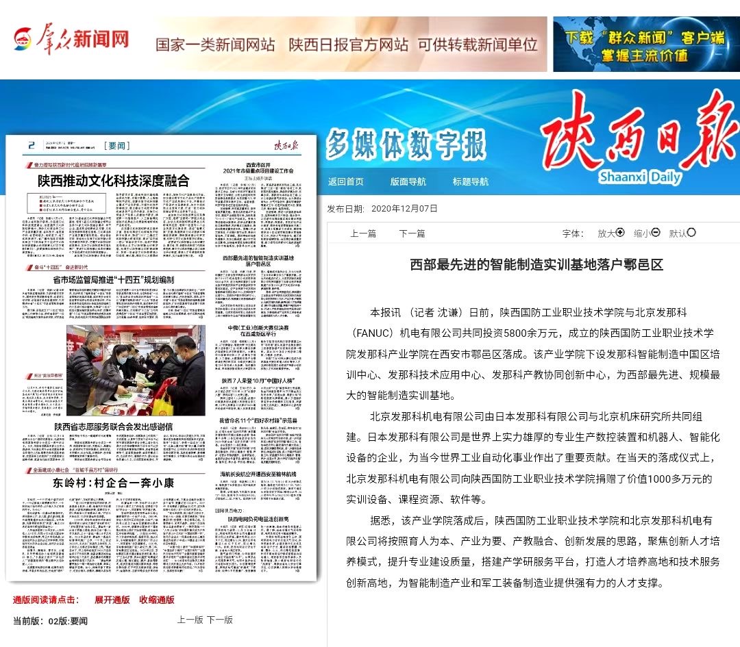 据悉,FANUC产业学院落成后,陕西国防职业技术学院和北京发那科机电有限公司将按照育人为本、产业为要、产教融合、创新发展的思路,聚焦创新人才培养模式,提升专业建设质量,搭建产学研服务平台,打造人才培养高地,打造技术服务创新高地,为智能制造产业和军工装备制造业提供强有力的人才支撑。