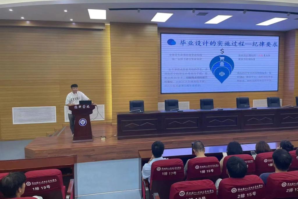 为有效落实学生的毕业论文选题,确保论文选题、研究、编写、答辩等工作按计划高效、有序实施,2024年7月7日晚19:30,智能制造学院在教四报告厅召开机电一体化技术、工业机器人技术专业2025届毕业设计动员大会。智能制造学院副院长张晨亮,机电教研室主任孙永芳,全体毕业设计指导教师以及2025届全体毕业生参加了此次大会。大会由智能制造学院李俊雨老师主持。