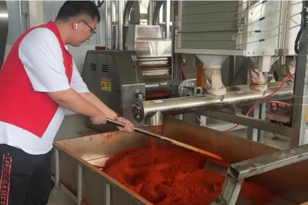 在生产车间内,老厂长详细介绍了辣椒从收集、筛选、烘干、炒制、研磨到成品分类包装的全过程。实践团同学们不仅亲眼见证了辣椒制品的生产流程,还亲自体验了辣椒面的制作过程,深刻感受到了传统工艺与现代科技的完美结合。