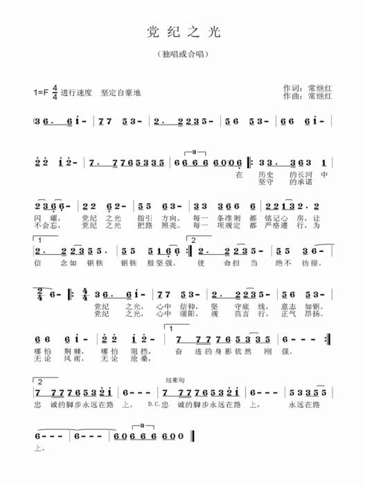 歌曲《党纪之光》由常继红老师作词作曲,以其坚定自豪的旋律和铿锵有力的歌词,生动诠释了党纪的重要性和神圣使命。歌曲采用进行速度,旋律优美动听,易于传唱,歌词紧扣党纪学习教育主题,将党的纪律要求融入其中,充满了正能量。