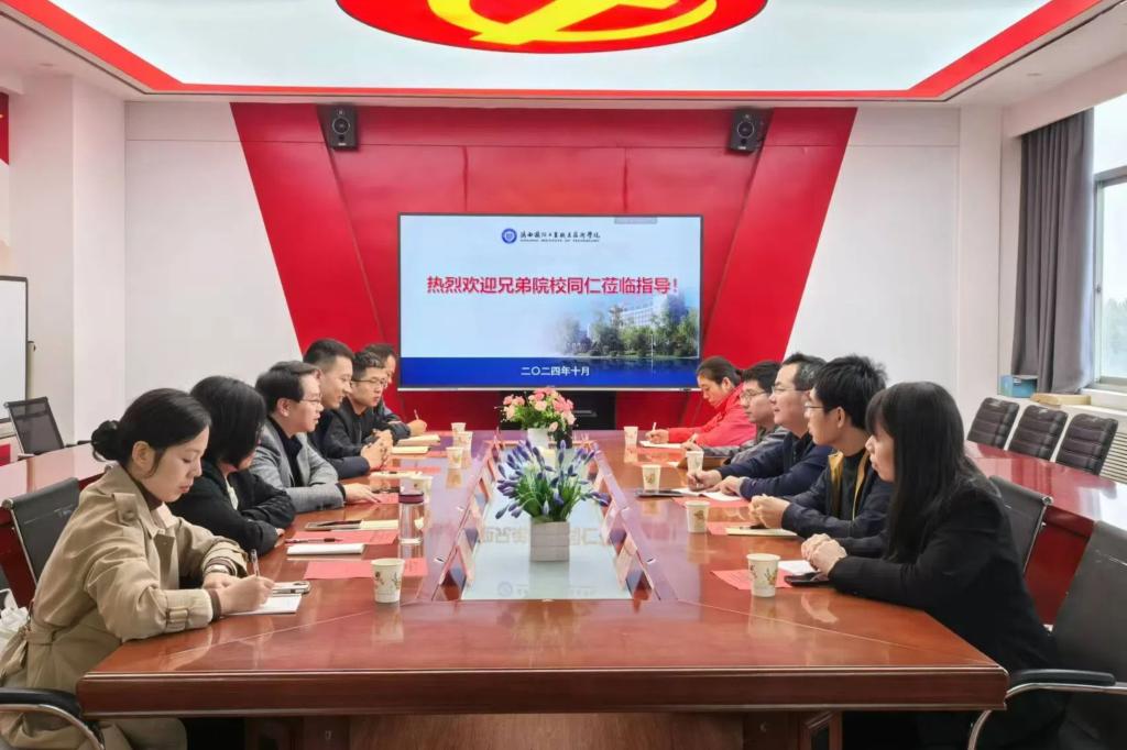 首先,张晨亮对参与人员做了介绍,并带领大家一同观看了学校宣传片。张俊勇对兄弟院校同仁的到来表示热烈欢迎,简要介绍了学校的办学历史、办学特色和办学成果,并表示希望双方日后能够互学互鉴,持续深化合作交流。随后,陈永刚对我校的热情接待表示感谢,对我校发展过程中取得的成绩予以称赞,希望可以不断深化合作,共促发展。最后,双方围绕产教融合、社会服务以及产业学院建设、管理等方面展开深入交流讨论。