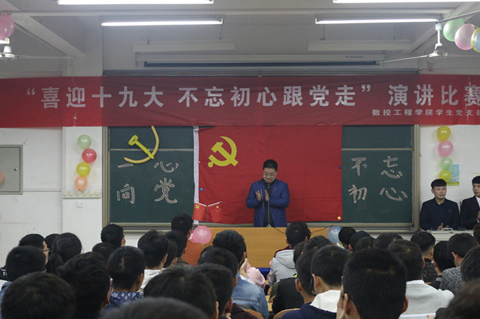 为庆祝中国共产党第十九次全国代表大会的召开,充分展现新时代学生党员的精神面貌,进一步推动“两学一做”活动取得实效,10月20日晚,数控工程学院学生党支部在3-407举行了以“喜迎十九大不忘初心继续前行”为主题的演讲比赛决赛,各参赛选手用激情演讲展示了数控工程学院学生积极向上的精神面貌,取得了良好的活动效果。