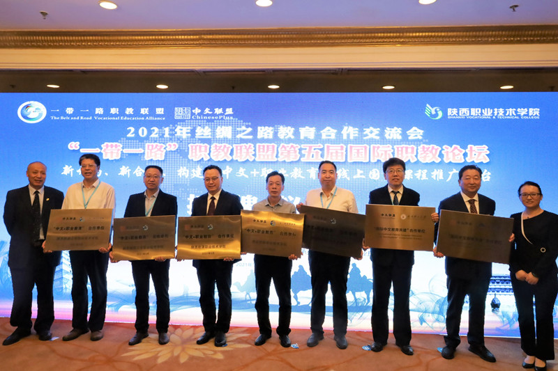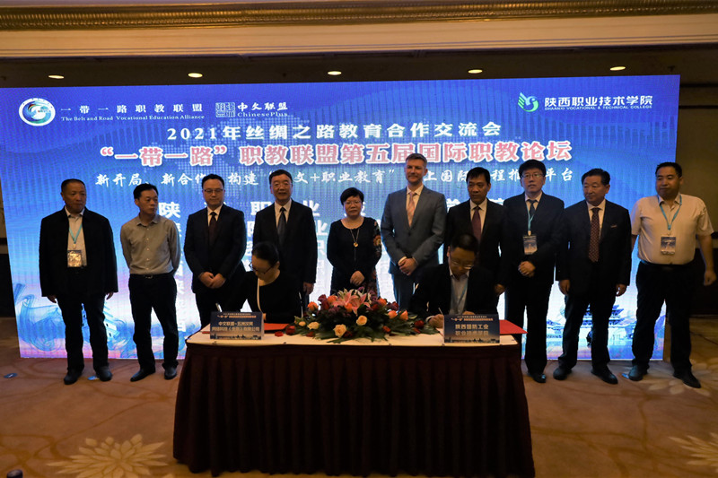 本届丝绸之路教育合作交流会以“文明互鉴,交流共享”为主题,围绕丝绸之路高等教育、职业教育、信息技术、航空航天、能源化工、公共卫生健康、政策研究等领域,设置23个平行论坛。我校参加了其中的“一带一路”职教联盟第五届国际职教论坛,与中文联盟-五洲汉风网络科技(北京)有限公司院校签署“中文+职业教育”线上国际课程推广平台协议并举行授牌仪式。