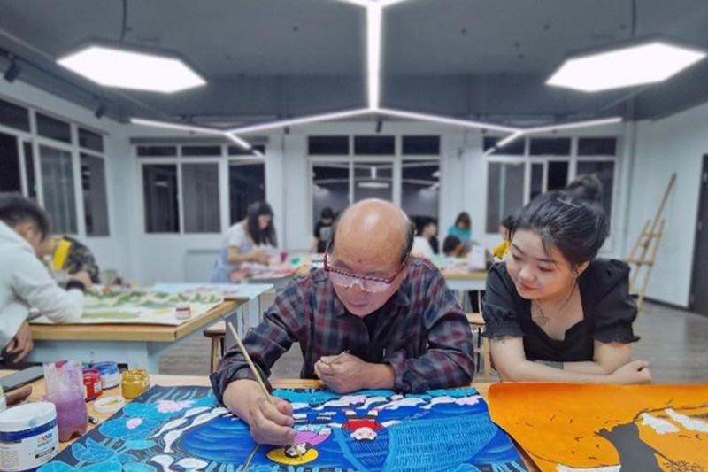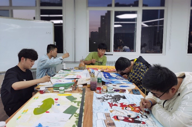 此次活动邀请了著名农民画家张青义进行指导。他带领学生欣赏优秀农民画作品,了解民间美术的发展历史及审美情趣,在此基础上深入学习农民画的创作方法和技巧。在农民画艺术家悉心的教导下,学生不仅掌握了农民画的创作方法,同时也感受到了民间艺术的魅力,激发起他们的民族文化自信心。通过艺术创作歌颂党的丰功伟绩,描绘美好生活。