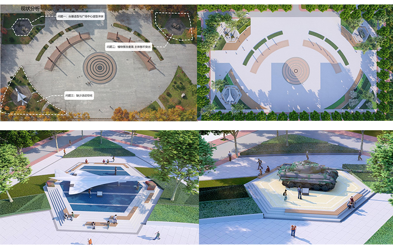 师生通过对励剑广场现状充分调研,以满足师生活动和美化校园为设计原则,经过多轮方案的探讨和分析,在最终设计方案中提出以下改造方法:一是场地增设活动空间,与师生产生互动;二是台基结合坐凳,满足休闲功能需求;三是场地造型与广场中心区域造型呼应,将台基与空间融合更加紧密;四是打破原先植物种植形式,使植物与场地结合更加紧密;五是色彩设计上利用与陈列品应用场景相呼应的颜色和图案,让台基不仅满足陈设功能的基础上,也为校园增添一些活力。