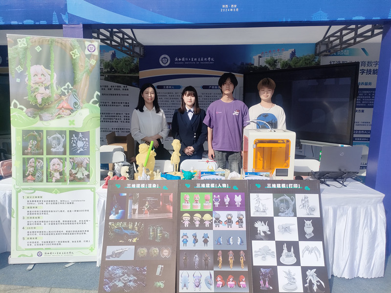 由智能制造学院张涛老师带领学生演示了三维逆向扫描技术,展示了五轴数控加工的发动机叶轮,电切削加工的长安塔、火箭、狼头等工艺作品;艺术与设计学院李夏菲老师带领学生演示了3D打印在动漫制作方面的应用,展示了动漫角色、场景道具、手办模型等学生优秀作品。
