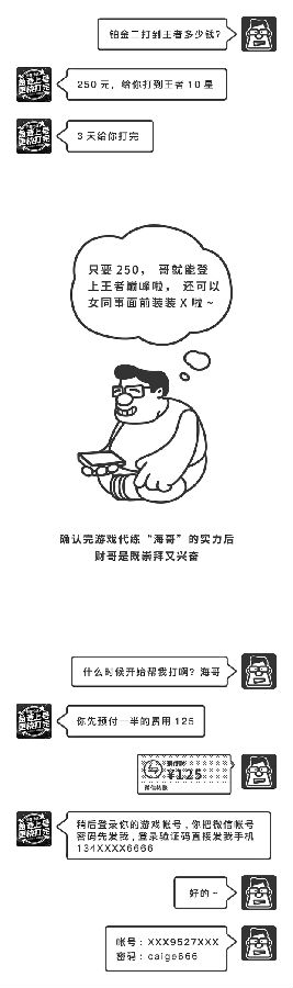 这是一起“名为代练上分实则盗号”的骗局。案例中的游戏代练只是幌子,真实目的是骗取用户的微信帐号密码,再向用户的微信好友实施欺诈骗钱。一起来看看骗子的套路: