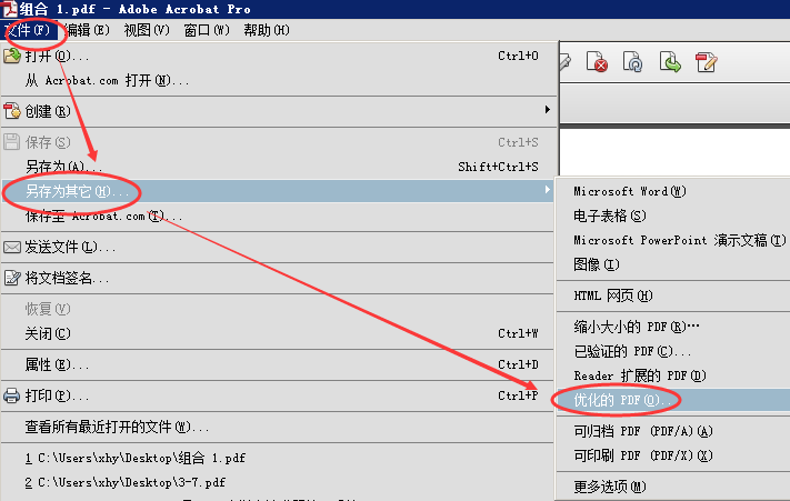 3、使用acrobat软件打开PDF文件,”文件“菜单,选择”另存为其它(H)“,”优化的PDF(O)“
