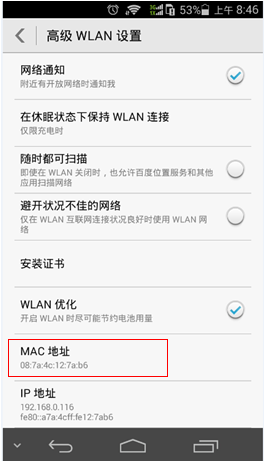 Wi-Fi页面中显示的Wi-Fi地址即表示当前设备的MAC地址。如下图所示: